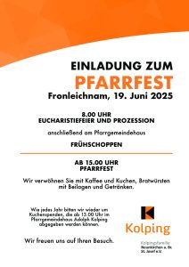 EINLADUNG ZUM PFARRFEST Fronleichnam, 19. Juni 2025 8.00 UHR – EUCHARISTIEFEIER UND PROZESSION anschließend am Pfarrgemeindehaus FRÜHSCHOPPEN AB 15.00 UHR – PFARRFEST Wir verwöhnen Sie mit Kaffee und Kuchen, Bratwürsten mit Beilagen und Getränken. Wie jedes Jahr bitten wir wieder um Kuchenspenden, die ab 13.00 Uhr im Pfarrgemeindehaus Adolph Kolping…