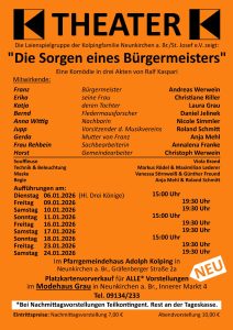 Die Laienspielgruppe der Kolpingfamilie Neunkirchen a. Br. zeigt: „Die Sorgen eines Bürgermeisters“ Dienstag (Hl. 3 Könige)06.01.202615:00 UhrFreitag09.01.202619:30 UhrSamstag10.01.202619:30 UhrSonntag11.01.202615:00 UhrFreitag16.01.202619:30 UhrSamstag17.01.202619:30 UhrSonntag18.01.202615:00 UhrFreitag23.01.202619:30 UhrSamstag24.01.202619:30 Uhr Kurzinformation: Franz hat bei seinem Amtsantritt als Bürgermeister vor vier Jahren seiner Gemeinde den Bau eines Industriegebiets versprochen. Durch die finanziellen Belastungen muss an allen…